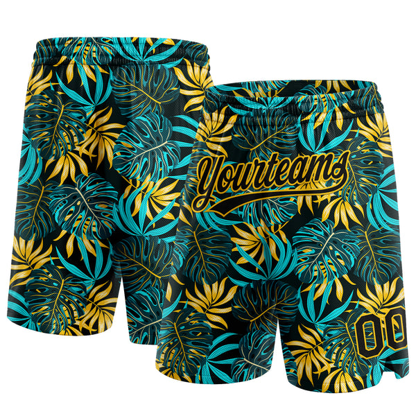 Custom Black Yellow 3D Pattern Tropical Plants Authentic Basketball Shorts