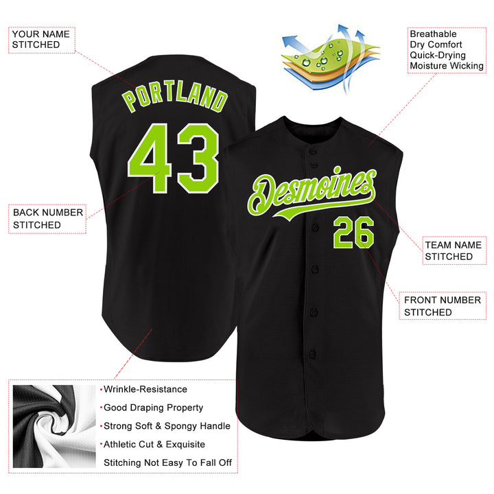 Custom Black Neon Green-White Authentic Sleeveless Baseball Jersey