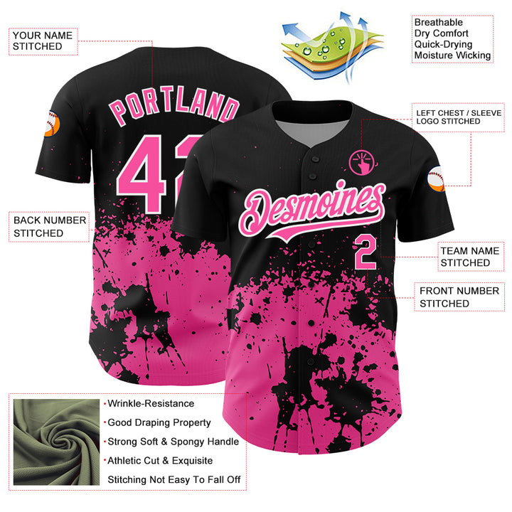 Custom Black Pink-White 3D Pattern Design Abstract Splash Grunge Art Authentic Baseball Jersey