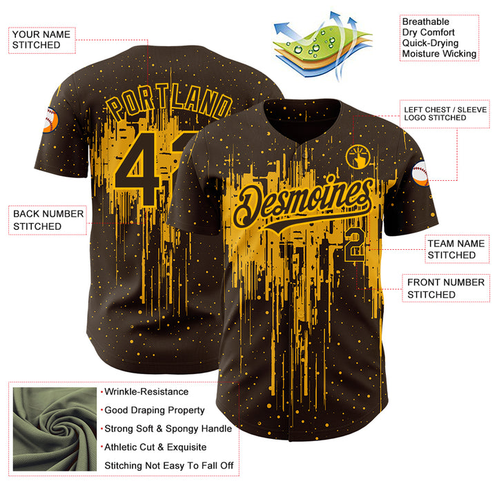Custom Brown Gold 3D Pattern Design Dripping Splatter Art Authentic Baseball Jersey