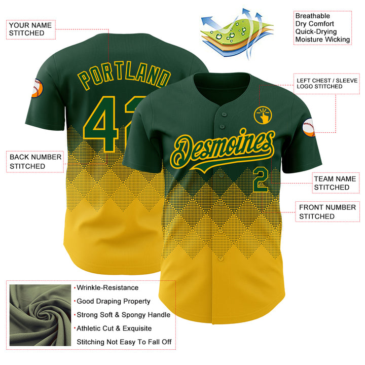Custom Green Gold 3D Pattern Design Gradient Square Shapes Authentic Baseball Jersey