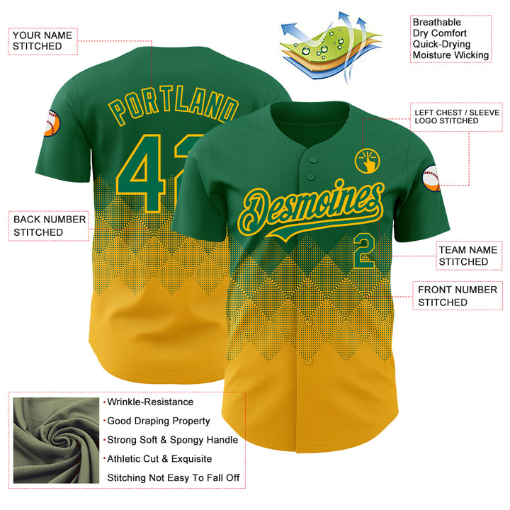Custom Kelly Green Gold 3D Pattern Design Gradient Square Shapes Authentic Baseball Jersey