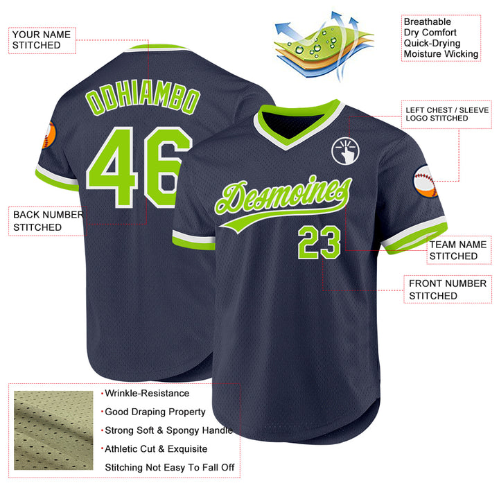 Custom Navy Neon Green-White Authentic Throwback Baseball Jersey