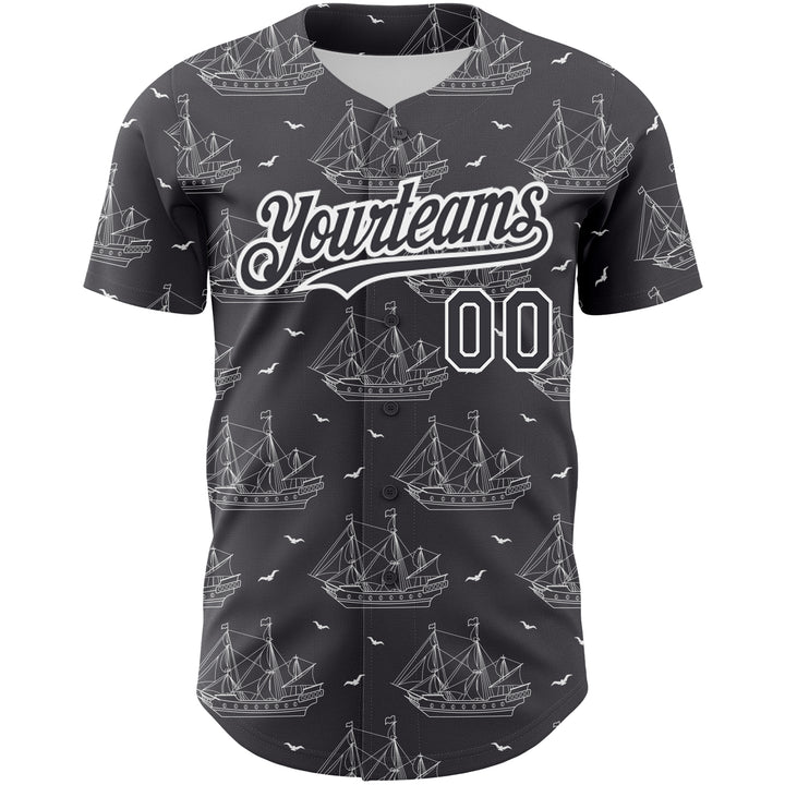 Custom Steel Gray White 3D Pattern Design Ship Frigate With Seagulls Authentic Baseball Jersey