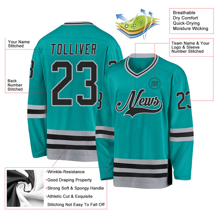 Custom Aqua Black-Gray Hockey Jersey