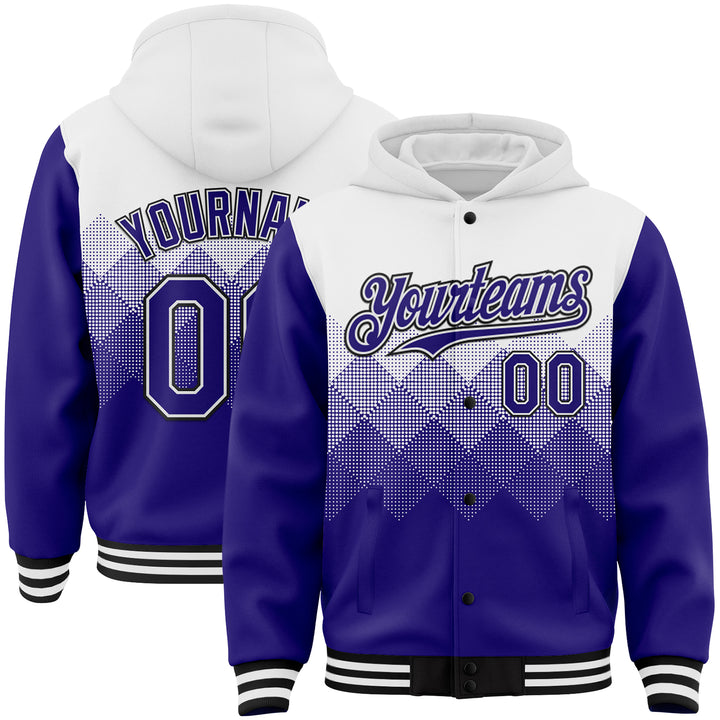 Custom White Dark Purple-Black Gradient Square Shape 3D Pattern Design Bomber Full-Snap Varsity Letterman Hoodie Jacket