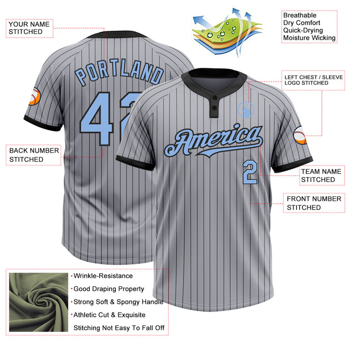 Custom Gray Black Pinstripe Light Blue Two-Button Unisex Softball Jersey