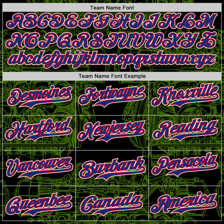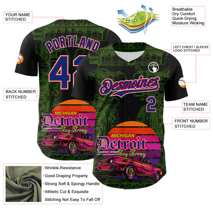 Custom Black Royal Green Fire Red-White 3D Pattern Design Detroit Cityscape Muscle Car Engine Authentic Baseball Jersey