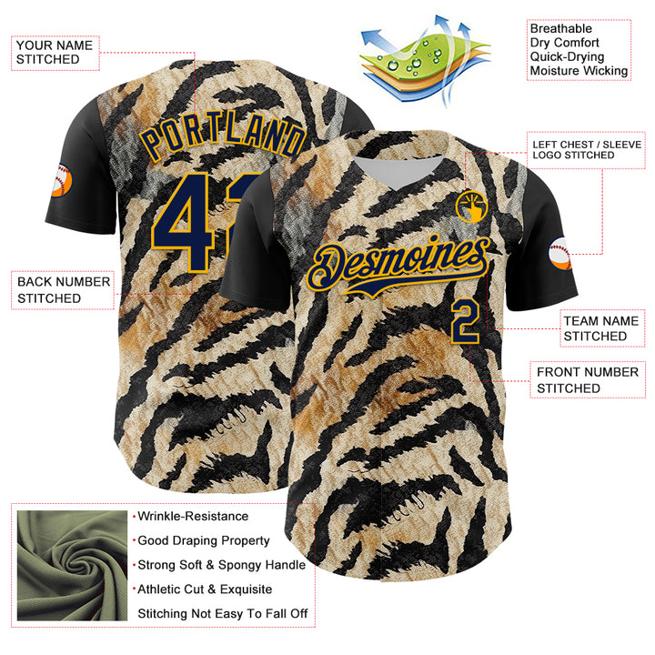 Custom Black Navy-Gold 3D Pattern Design Burner Costumes Tiger Print Authentic Baseball Jersey