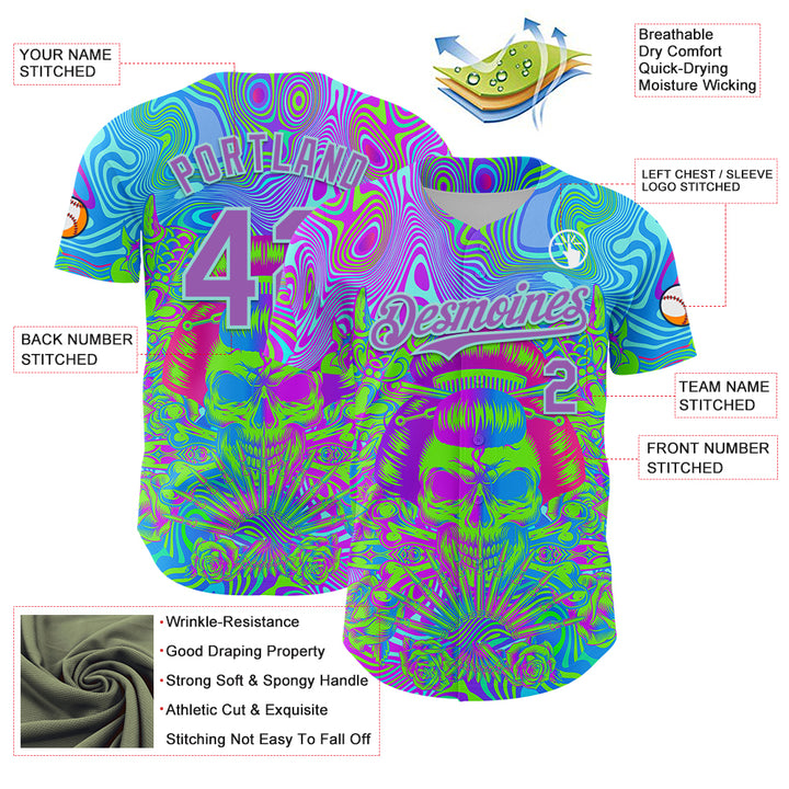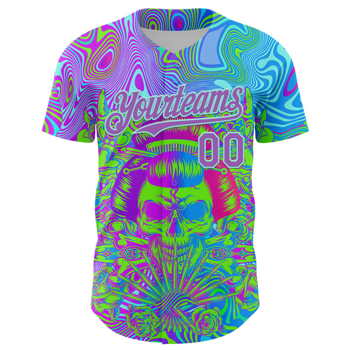 Custom Blue Medium Purple-Ice Blue 3D Pattern Design Trippy Magic Mushrooms Skull Authentic Baseball Jersey