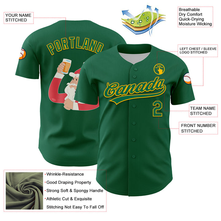 Custom Kelly Green Gold 3D Funny Christmas Authentic Baseball Jersey