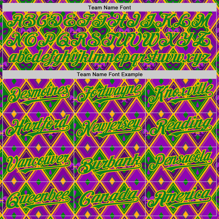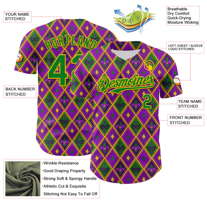 Custom Purple Grass Green-Gold 3D Pattern Design Mardi Gras Shrove Tuesday Authentic Baseball Jersey