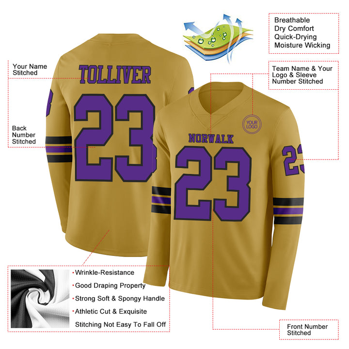 Custom Old Gold Purple-Black Long Sleeve Authentic Football Jersey