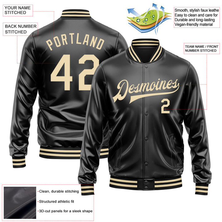 Custom Black Cream Bomber Full-Snap Varsity Faux Leather Letterman Jacket