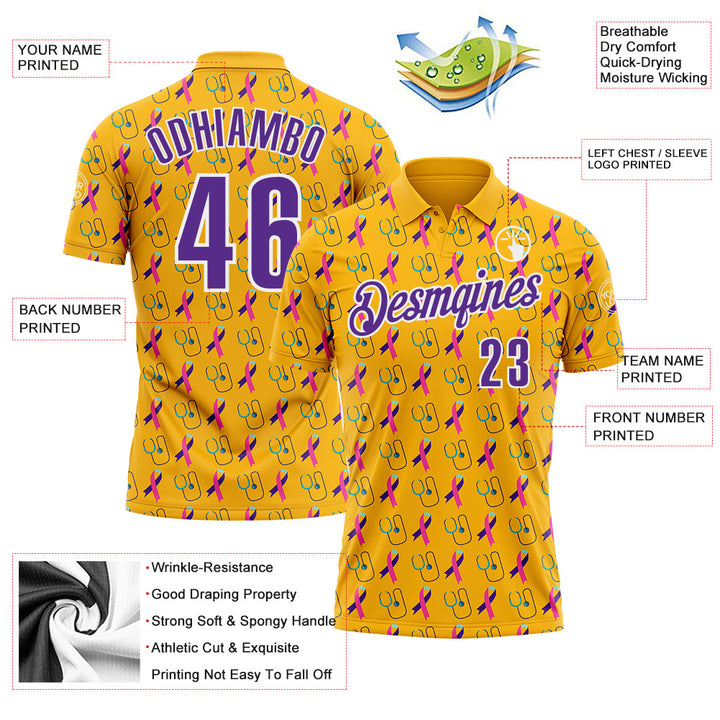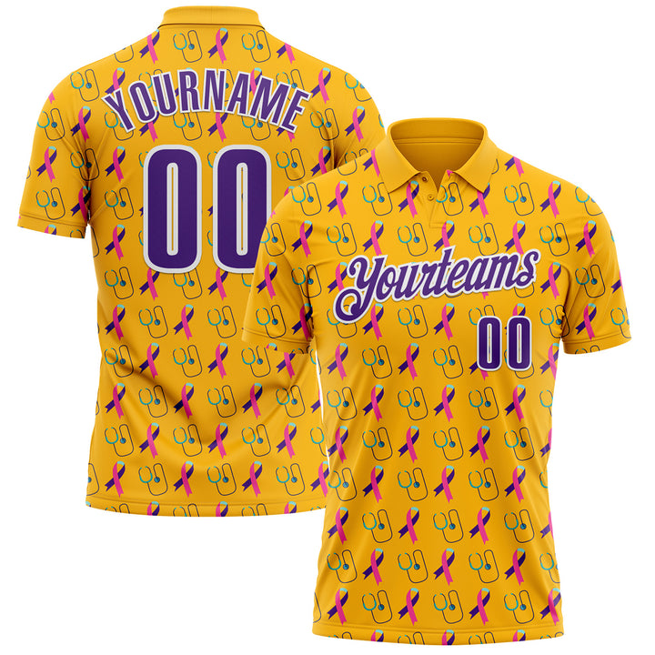 Custom Gold Purple-White 3D Pattern Design Purple Teal Pink Ribbon Thyroid Cancer Awareness World Cancer Day Performance Polo Shirt