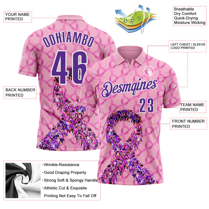 Custom Light Pink Purple-White 3D Pink Ribbon Breast Cancer Awareness Performance Polo Shirt