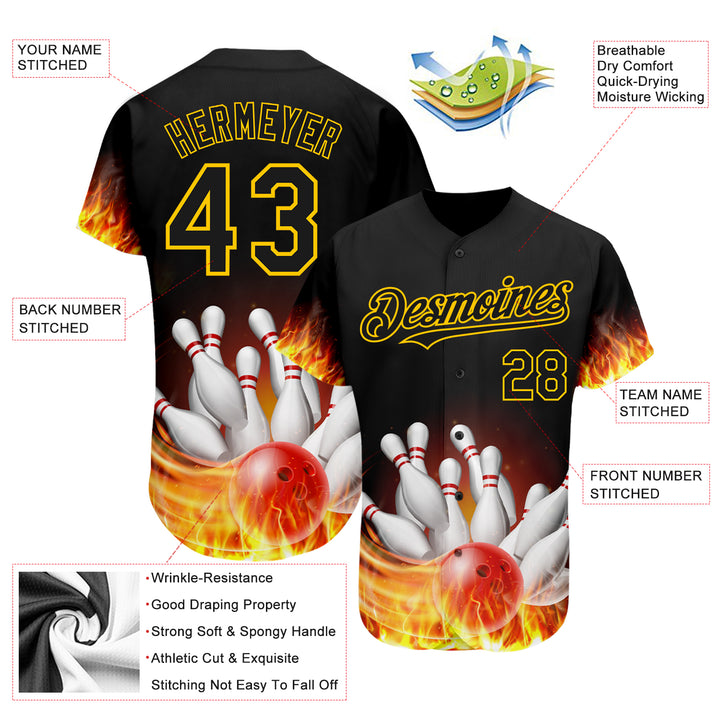 Custom Black Gold 3D Pattern Design Flame Bowling Authentic Baseball Jersey