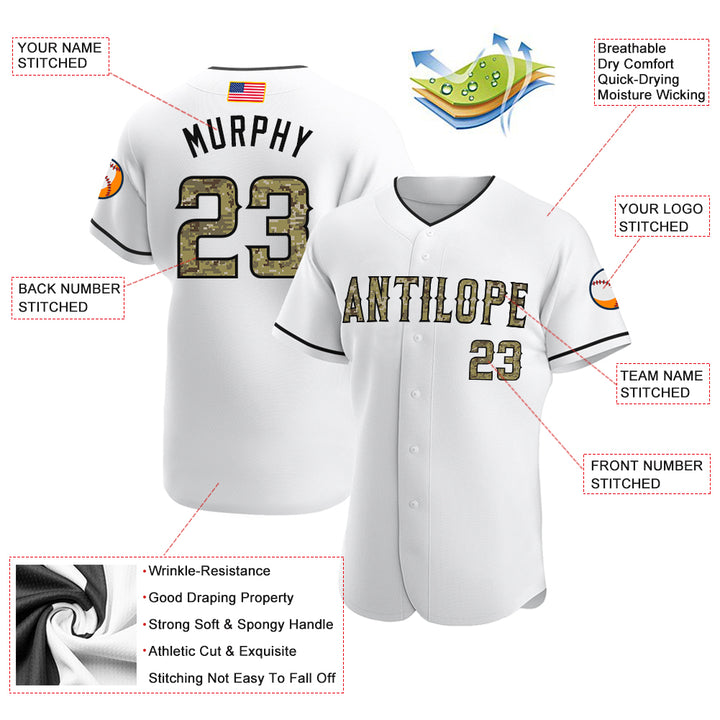Custom White Camo-Black Authentic American Flag Fashion Baseball Jersey