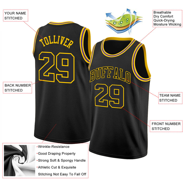 Custom Black Black-Gold Round Neck Rib-Knit Basketball Jersey
