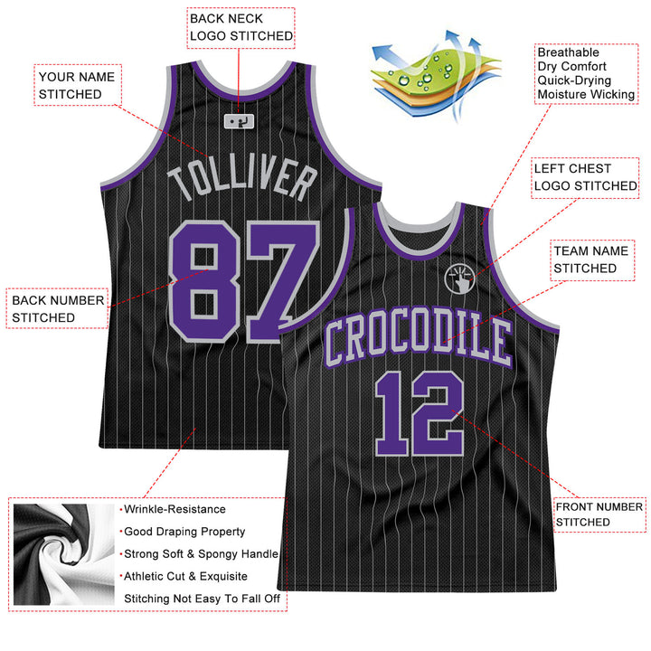 Custom Black Gray Pinstripe Purple-Gray Authentic Basketball Jersey