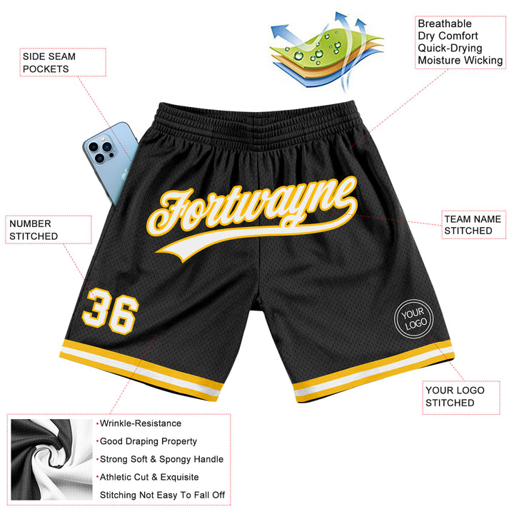 Custom Black White-Gold Authentic Throwback Basketball Shorts