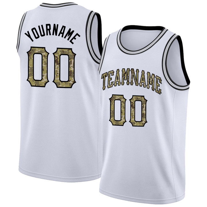 Custom White Camo-Black Round Neck Rib-Knit Basketball Jersey