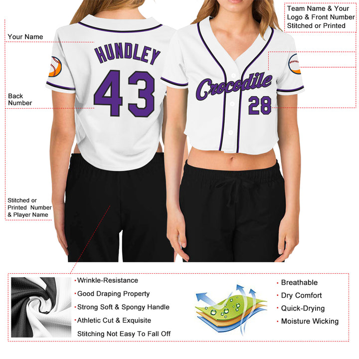 Custom Women's White Purple-Black V-Neck Cropped Baseball Jersey