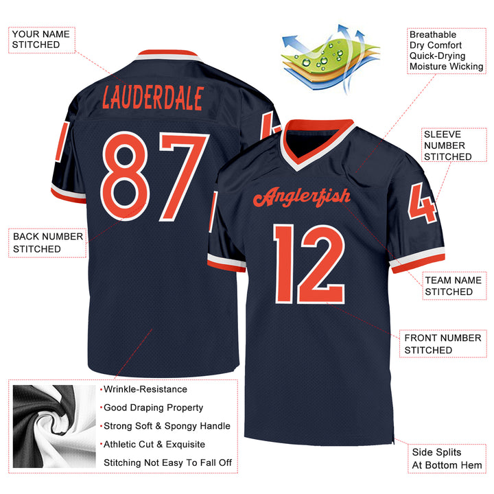 Custom Navy Orange-White Mesh Authentic Throwback Football Jersey