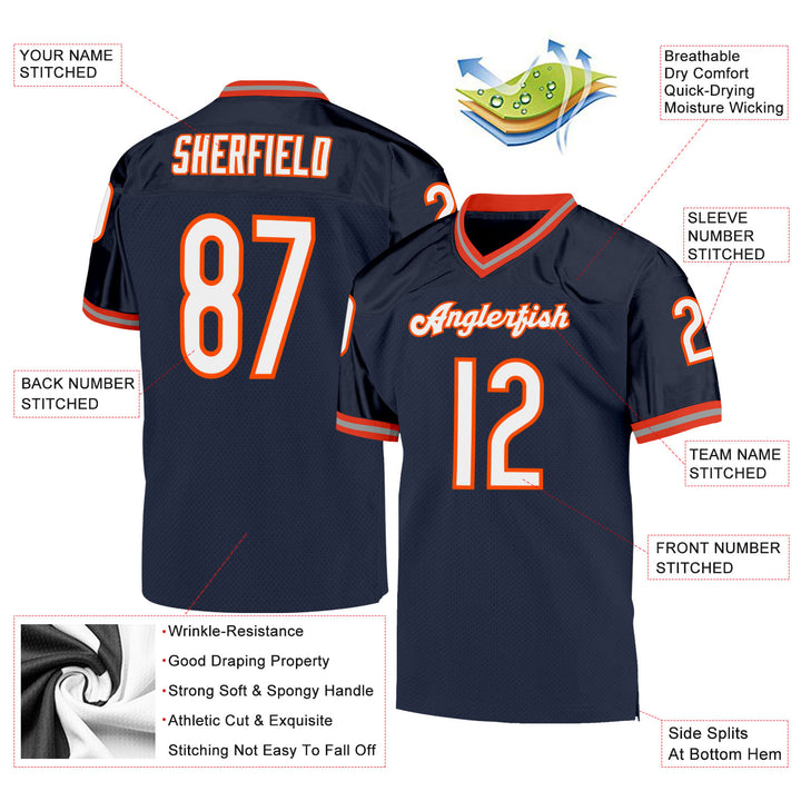 Custom Navy White-Orange Mesh Authentic Throwback Football Jersey