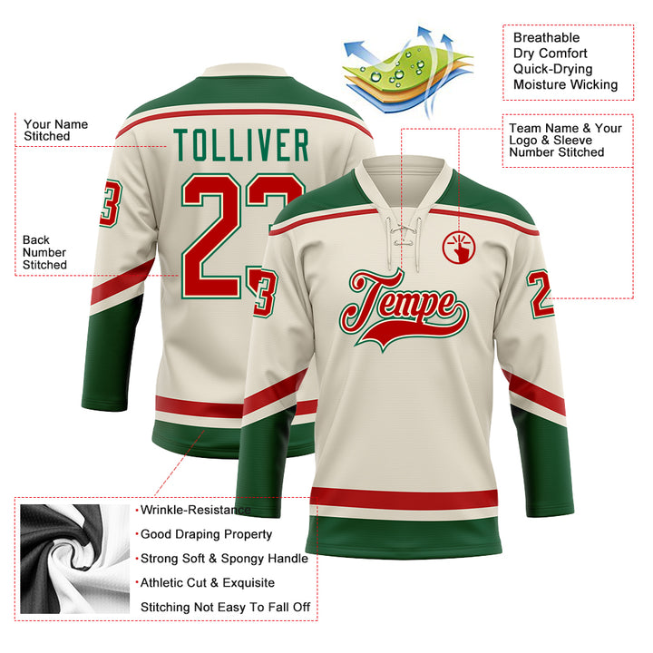 Custom Cream Red-Kelly Green Hockey Lace Neck Jersey