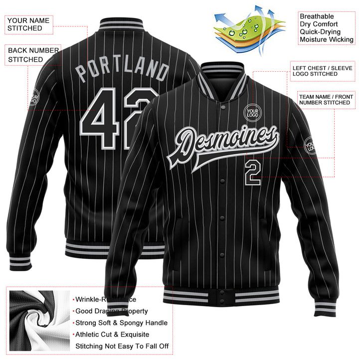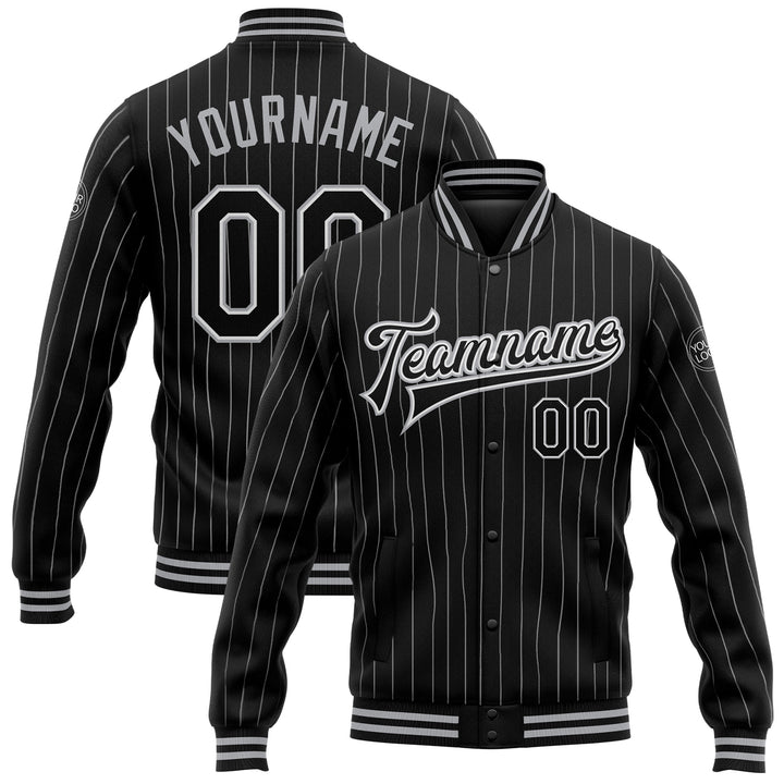 Custom Black White Pinstripe Black-Gray Bomber Full-Snap Varsity Letterman Jacket