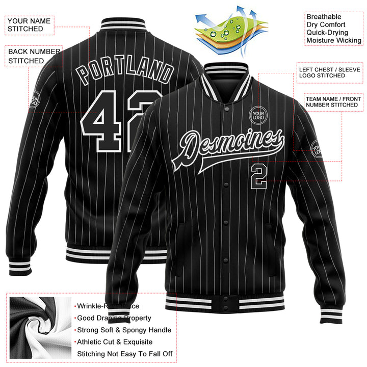 Custom Black White Pinstripe White Bomber Full-Snap Varsity Letterman Jacket
