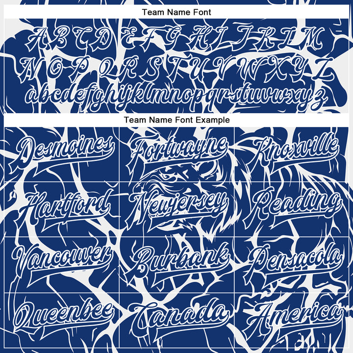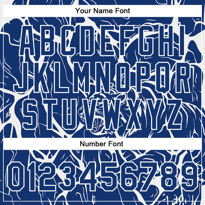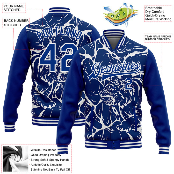 Custom Royal White Abstract Network And Tiger 3D Pattern Design Bomber Full-Snap Varsity Letterman Jacket