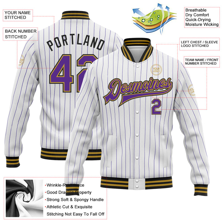 Custom White Purple Pinstripe Old Gold-Black Bomber Full-Snap Varsity Letterman Jacket