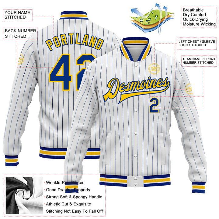 Custom White Royal Pinstripe Yellow Bomber Full-Snap Varsity Letterman Jacket
