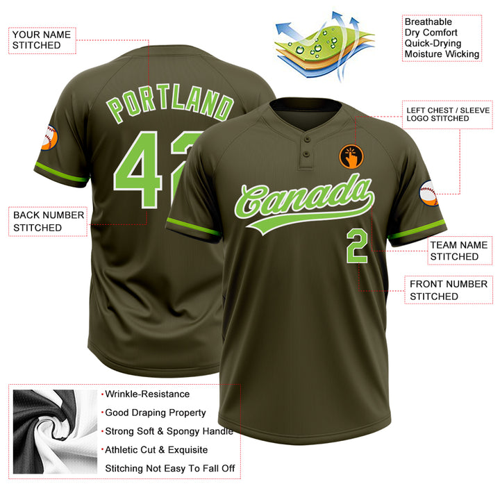 Custom Olive Neon Green-White Salute To Service Two-Button Unisex Softball Jersey