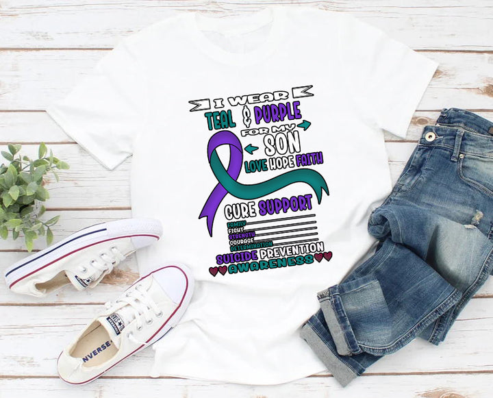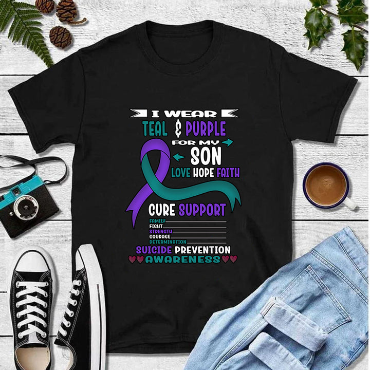 I Wear Teal & Purple For My Son Love Hope Faith Cure Support Family Fight Strength Courage Determination Suicide Prevention Awareness T-Shirt